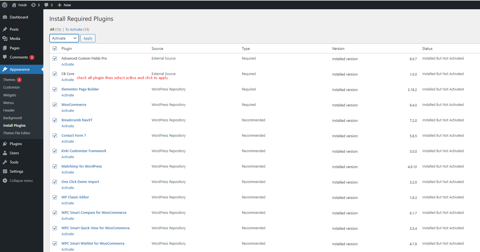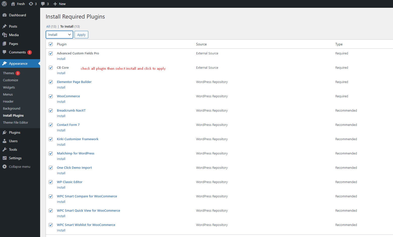 prompted to install the required plugins at the top of your dashboard.